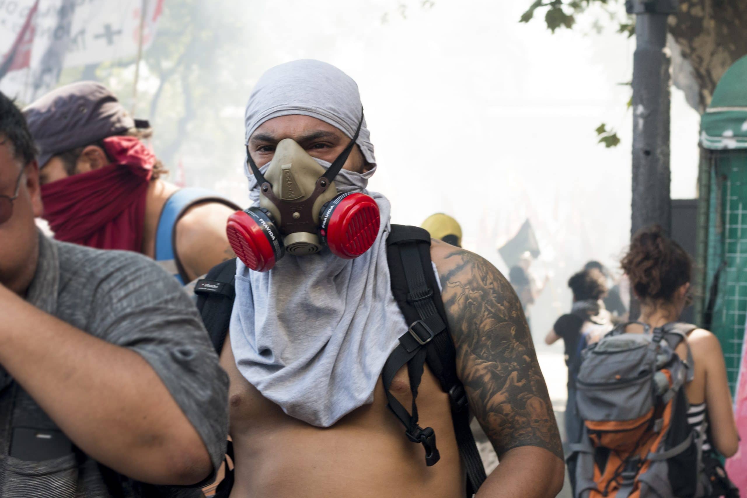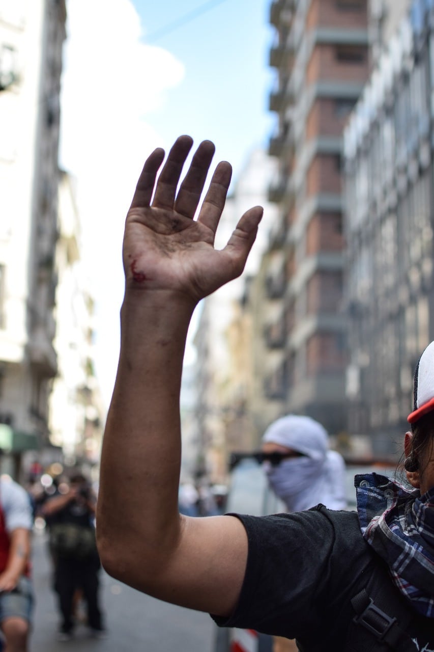 Se rearma la protesta y vuelve el agua. Vuelan piedras. Las que dan en el blanco se festejan. Se rearma la protesta y siguen las balas. Se rearma la protesta. Varias veces. Se agita la gendarmería. No hay nadie que parezca padecer la orden de represión. Más bien es un disfrute tras las vallas. Las corren para avanzar y les que protestan empiezan a correr. Vienen las motos, más balas de goma azules que luego se arrinconarán contra el cordón o rebotarán en la espalda de les manifestantes.