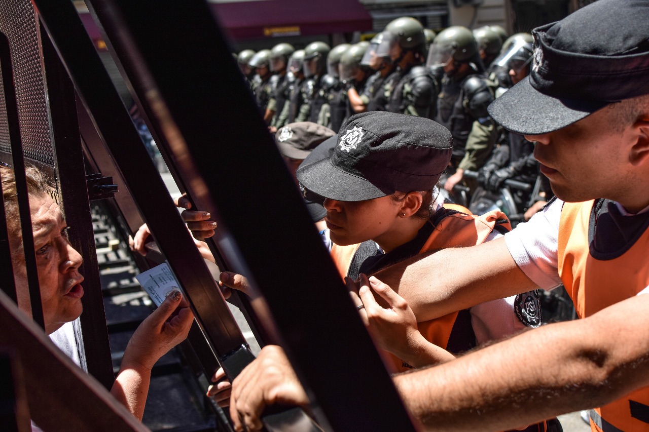 Una mujer joven quiere pasar por un hueco y escucha un: “Aca no pasa nadie”, junto a una mano sobre el cuello y varios golpes más. A les gendarmes les brillan los ojos, algunes se rien. Uno que está al frente tiene la mirada desorbitada y se prepara para pegar. Parece rabioso, pega la cabeza contra su escudo y sonríe ante los insultos. En la esquina de la pizzería La Americana, uno de esos que no pueden parar de ser jefes ni un minuto, le dice a un empleado de gorra: “Anda sacando las piedras, por lo menos”.