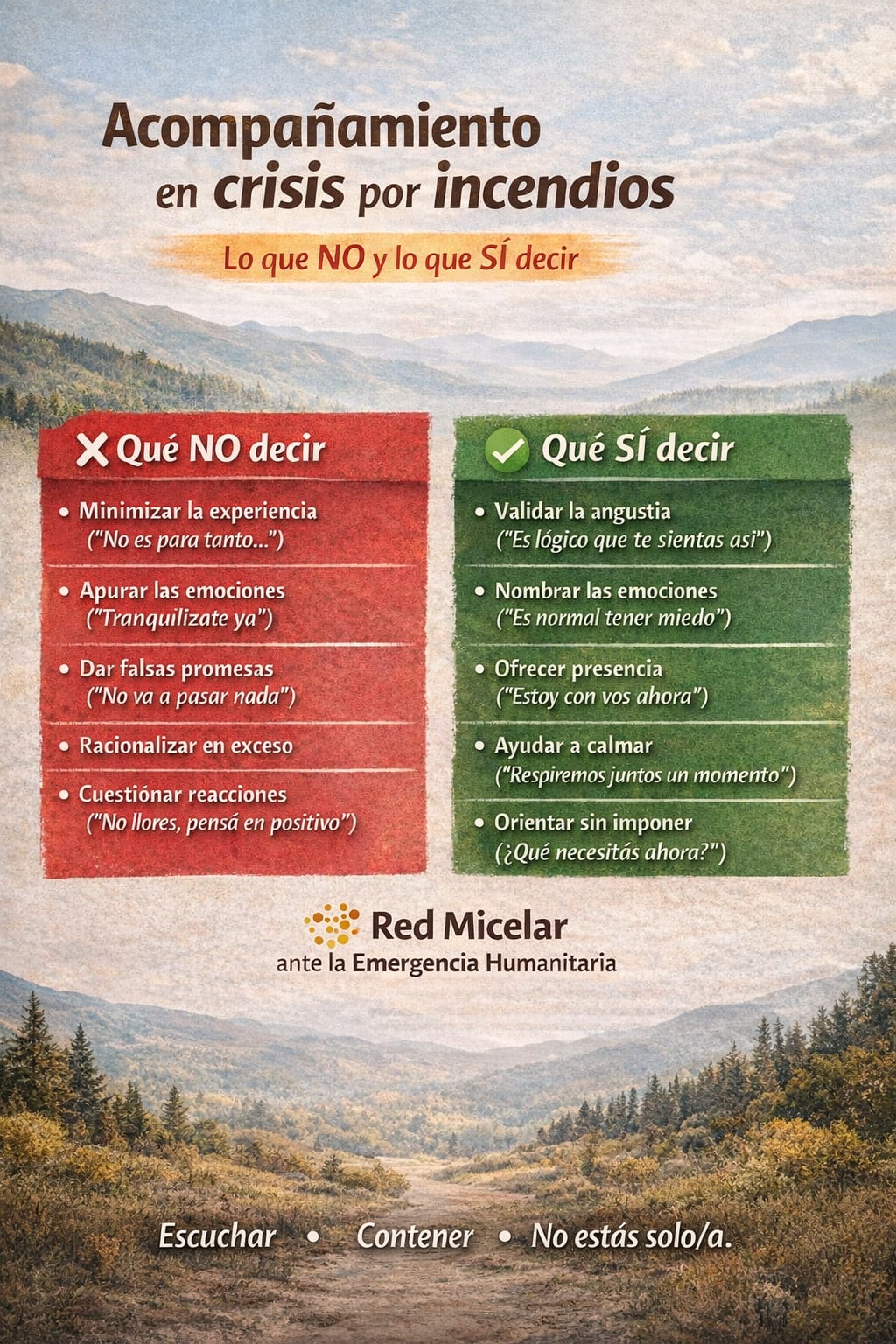 En 2026, acompañaron la retraumatización de quienes habían perdido mucho el año anterior. Para el trauma y la psiquis, el tiempo no es lineal; ver el fuego otra vez es arder de nuevo. Frente a esto, la Red Micelar ofrece «zonas de alivio» en los territorios y el apoyo desde una guardia telefónica que permite una distancia operativa y emocional para los agentes de intervención.
